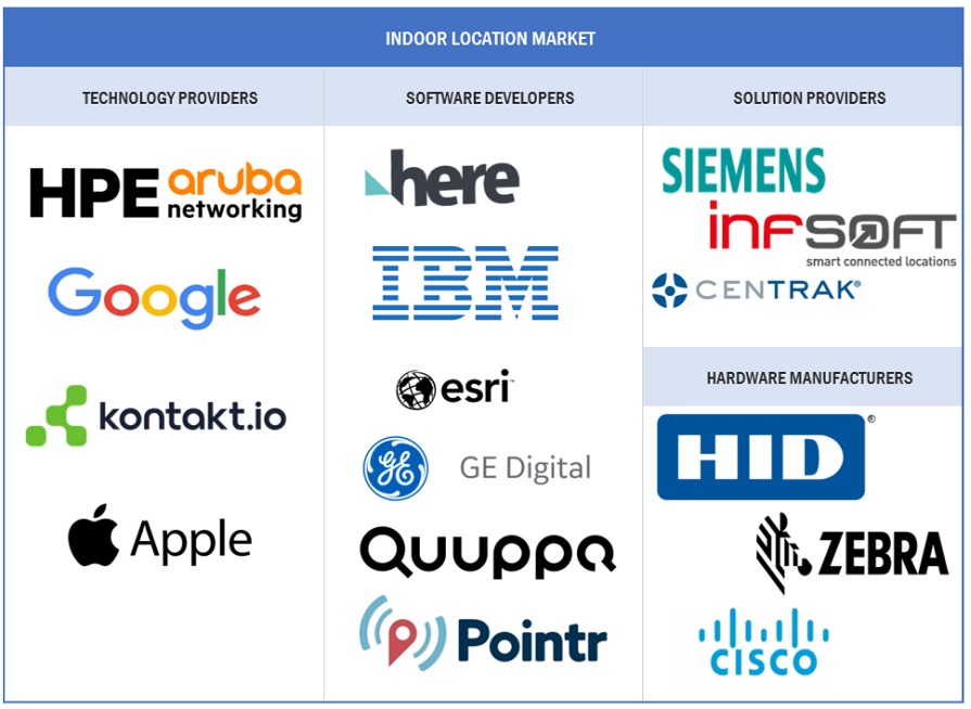 - Competitive Assessment: In-depth assessment of market shares, growth strategies and service offerings of leading players like Zebra Technologies Corporation (US), Cisco (US), Google (US), Microsoft (US), HPE (US), Apple (US), Esri (US), Acuity Brands(US), Inpixon(US), HERE Technologies (US), HID Global (US), CenTrak (US), Sonitor (Norway), Ubisense (UK), infsoft (Germany), Polaris Wireless (US), Quuppa (Finland), Securitas Healthcare (US), Navigine (US), Blueiot (China), Kontakt.io (US), AiRISTA (US), InnerSpace (Canada), Syook (India), Oriient (Israel), Navenio (England), Situm (Spain), Pozyx (Belgium), Azitek (Portugal), and Mapxus (China).