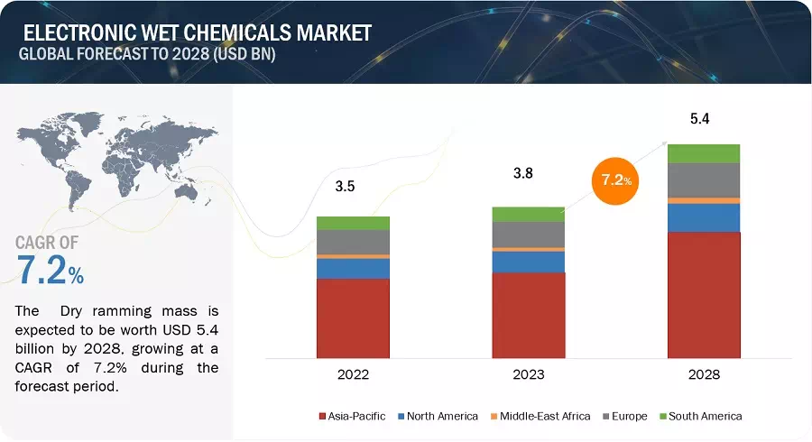 The Electronic wet chemicals Market is projected to reach USD 5.4 billion by 2028, at a CAGR of 7.2% from USD 3.8 billion in 2023. The global electronic wet chemicals market is experiencing rapid growth due to several key factors. One of the main drivers of growth is the increasing demand for hydrogen peroxide from the semiconductor industry.