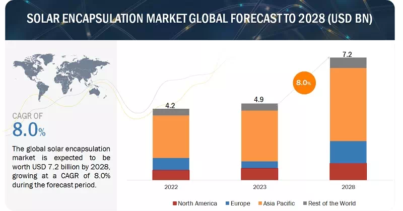 The global solar encapsulation market is estimated to grow from USD 4.9 Billion in 2023 to USD 7.2 Billion by 2028; it is expected to record a CAGR of 8.0% during the forecast period. The growth of the solar encapsulation market is attributed to increased awareness and efforts to decrease carbon emissions and the expansion of hydrogen infrastructure, covering production, storage, and distribution. Additionally, the solar encapsulation market will grow in the future owing to the increased requirement for solar encapsulation setup in power generation and combined heat and power (CHP) applications.
