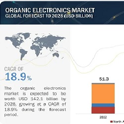 The global organic electronics market is projected to grow from USD 59.9 billion in 2023 to USD 142.1 billion by 2028, registering a CAGR of 18.9% during the forecast period. The escalating demand for organic electronic devices like OLED displays, solar cells, and transistors primarily propels the market’s growth.