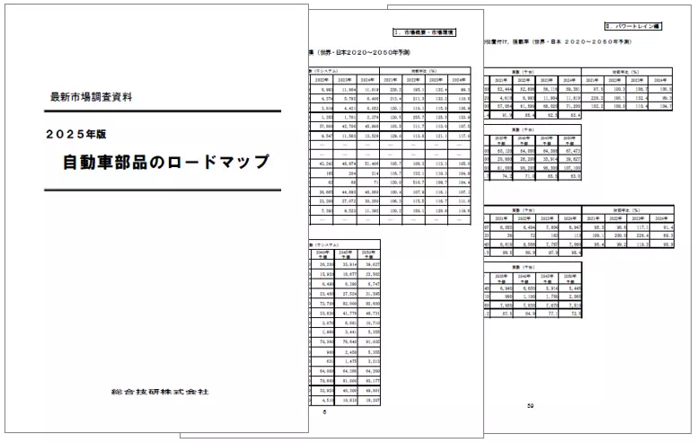総合技研「2025年版 自動車部品のロードマップ」は自動車の特に重要なシステムおよび部品についてロードマップを提供しています。技術の変遷・需要構造の変化に関する分析は2005年から2050年を対象に行っています。また技術ロードマップについては2050年までを対象に分析・解説しています。
